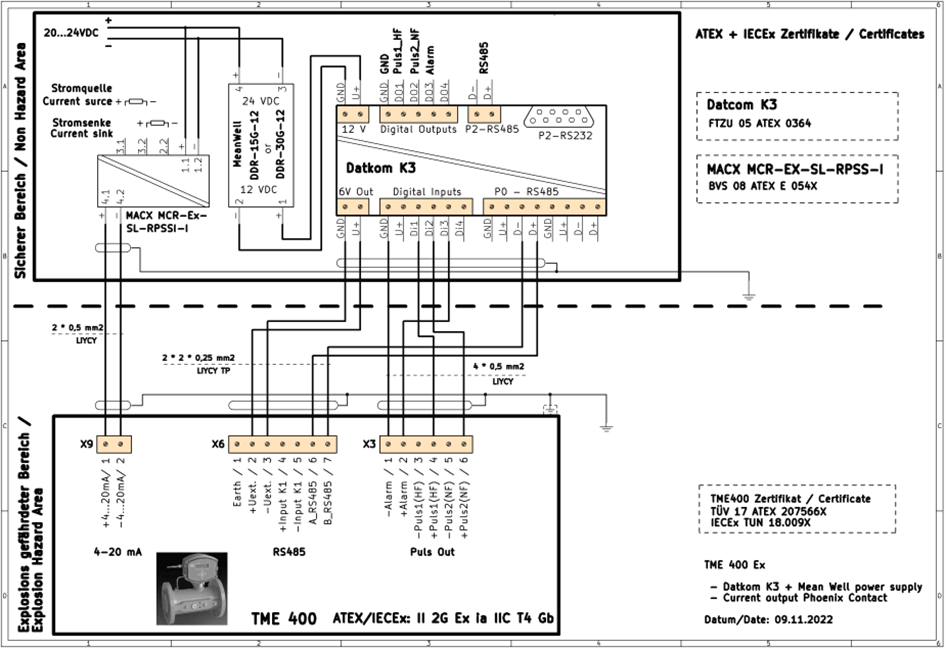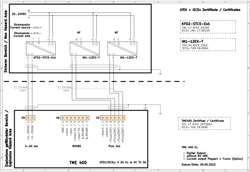 To enable communication with the TME400, the TME400 has a passive RS485 interface on terminal X6, i.e. the interface must be supplied externally via Uext or Iext. More information on this can be found in the circuit diagrams.